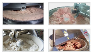 1. 斬拌機利用斬刀高速旋轉的斬切作用,將肉塊,碎肉,脂肪等主要原料精細的斬切成肉餡或肉泥,同時將其它原 料如水、冰片、輔料一起攪拌成均勻的乳狀物。斬刀高速旋轉,可以縮短運行時間,減少物料發熱量,保持餡料的 天然色澤、彈性、出品率和產品的保質期。此外,該設備還適合用于魚類、水果、蔬菜的粉碎加工。